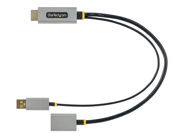 The HDMI to DP converter features a 1-foot (30 cm) cable between the HDMI and DP connectors, reducing strain on ports and connectors. The adapter includes an attached 1-foot (30 cm) USB-A cable for connecting to a nearby powered USB port or a USB wall charger.