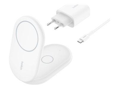Belkin BoostCharge 2-in-1 - Trådløst ladestativ - magnetisk, sammenleggbar, med Qi2 + AC-strømadapter - 15 watt - Fast Charge - hvit - for Apple iPhone 12, 13, 14, 15, 16