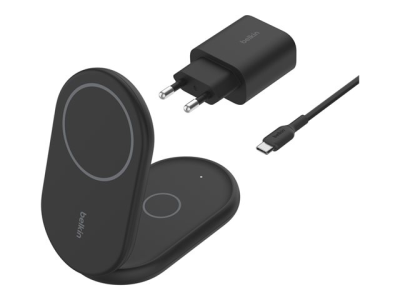 Belkin BoostCharge 2-in-1 - Trådløst ladestativ - magnetisk, sammenleggbar, med Qi2 + AC-strømadapter - 15 watt - Fast Charge - svart - for Apple iPhone 12, 13, 14, 15, 16