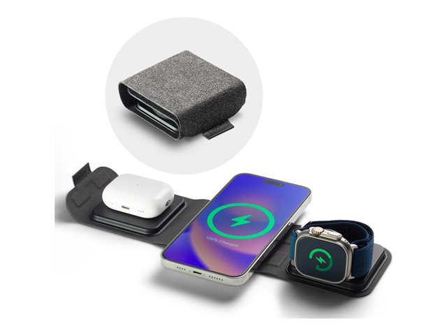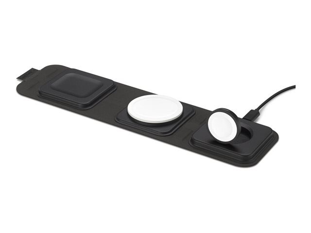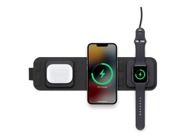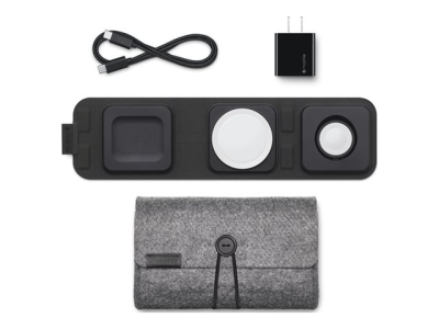Upgrade your on-the-go power. The 3-in-1 travel charger with MagSafe has dedicated charging spots for your iPhone, Apple Watch, and AirPods. The magnetic surface means you'll hit the charging sweet spot every time. No more searching for different outlets around the room. The 3-in-1 travel charger keeps you fully charged and organized whether you're on vacation or traveling for business. The travel kit comes with everything you need including a USB-C cable and wall adapter. Simplify packing with one handy kit that fits neatly in your bag.