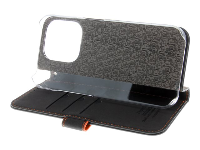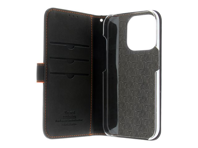 Insmat Exclusive - Lommebok for mobiltelefon - ekte skinn, polykarbonat, kartong+papir+aluminiumsfolie - svart, oransje - for Apple iPhone 15 Pro 650-3194