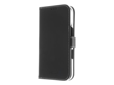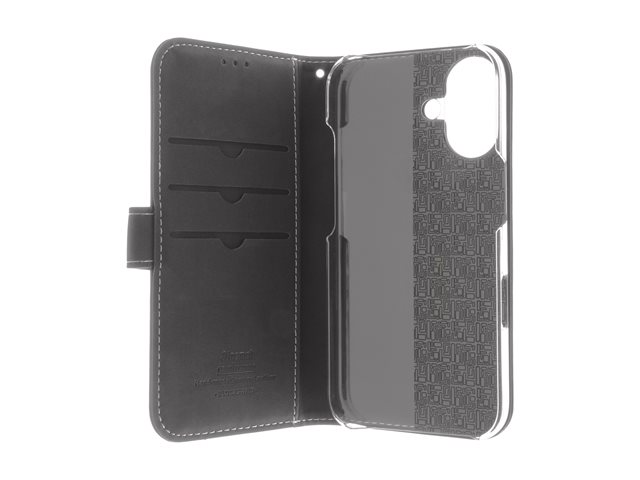 Insmat Exclusive - Lommebok for mobiltelefon - ekte skinn, kartong+papir+aluminiumsfolie, polykarbonat (PC), bomullssting - svart - for Apple iPhone 16 Plus 650-3279