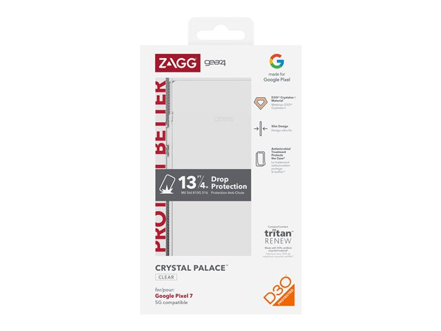 The Crystal Palace case unites sleek, transparent design with unbeatable drop protection. Made from D3O Crystalex, the clearest, thinnest, and most advanced non-yellowing impact protection material for phone cases, Crystal Palace is drop resistant up to 13 feet (4 meters). The backplate is made of polycarbonate, the same material that's used in bulletproof glass, so it will keep your device safe and sound. Crystal Palace is also more sustainable with Tritan Renew which contains 50% certified recycled content to help divert plastic waste from ZAGG's oceans and landfills.