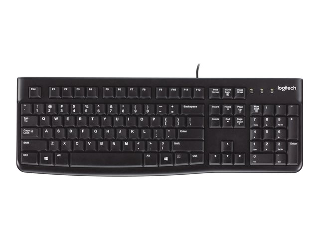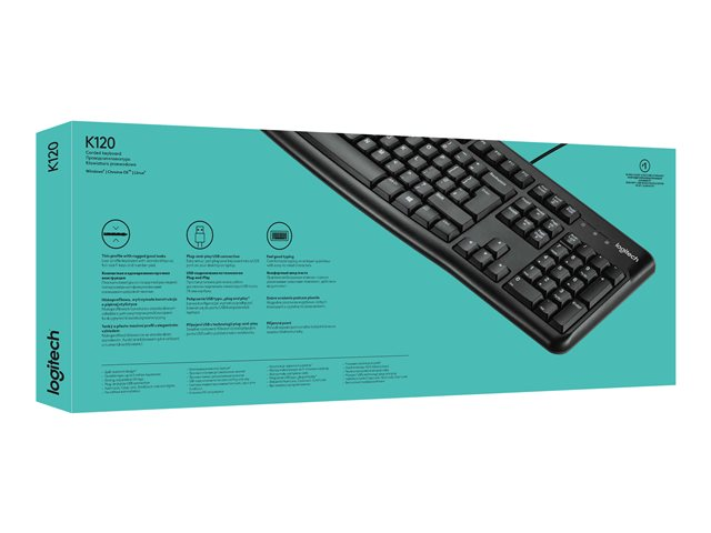 Logitech Keyboard K120 er et usb-tastatur som gjør det lettere å skrive, og som er laget for å vare. Hendene jobber komfortabelt på de flate, lydløse tastene, som har et standardoppsett med F-taster i full størrelse og numerisk tastatur. Du kan bare kople tastaturet til en usb-port på en stasjonær eller bærbar datamaskin, og skrive i vei. Dette slanke tastaturet er ikke bare elegant, det er også robust og vannavstøtende, og det har stødige føtter og taster som varer lenge.