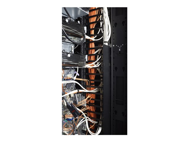 The vertical channels have smooth plastic fingers at 1U increments to allow patch cords to enter and exit in an organized manner.