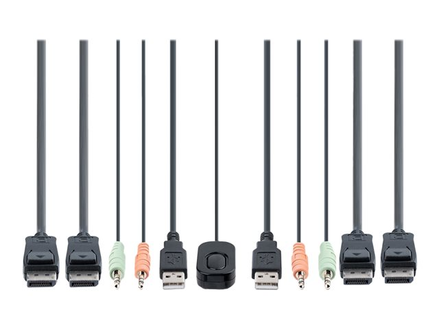 Share a mouse, keyboard, and dual 4K 60 Hz DisplayPort displays between two DisplayPort enabled computers, using this KVM Switch with built-in cables.