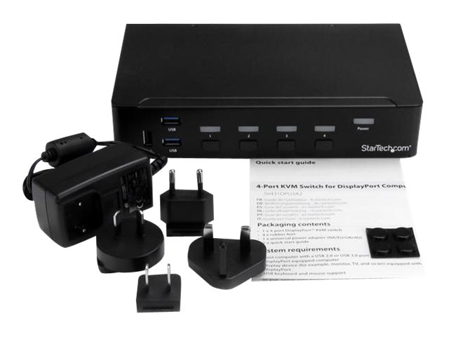 Control four DP computers using a single console with a built-in USB 3.0 hub for sharing additional peripheral devices. This 4-Port USB 3.0 DisplayPort KVM switch lets you control four DisplayPort (DP) computers with a single monitor, keyboard and mouse. The KVM also features 3.5 mm audio and a built-in 3-port USB 3.0 hub.