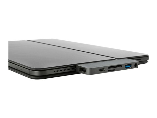 The Targus HyperDrive 6-in-1 USB-C Hub is a compact, versatile solution designed to meet the connectivity needs of modern professionals. With its array of ports, including HDMI for 4K Ultra HD and HDR support, USB-C with Power Delivery for charging, USB 3.1 Gen 1 for high-speed data transfer, and audio output, this docking station ensures you're always prepared, whether for presentations, data management, or multimedia tasks. The inclusion of expansion slots for microSDXC and SDXC UHS-I memory cards further enhances its utility, providing additional storage options. Encased in a durable aluminum enclosure, the HyperDrive is not only robust but also sleek and portable, making it an excellent companion for business trips and remote work. With its combination of high-resolution support, flexible connectivity, and durable design, the Targus HyperDrive 6-in-1 USB-C Hub is an essential tool for anyone looking to enhance their mobile computing experience.