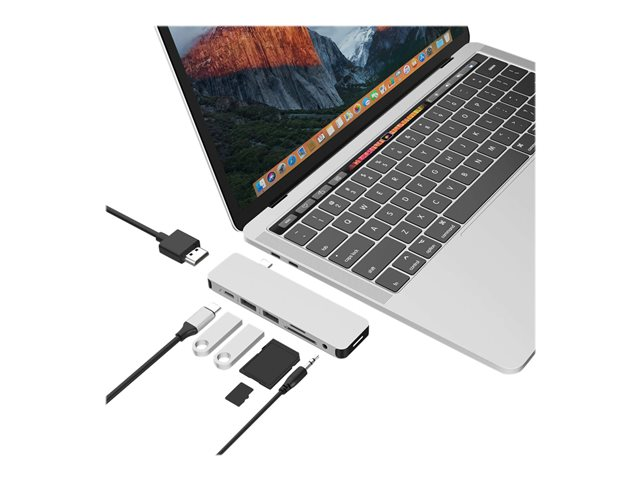 Form-fitting USB-C Hub for MacBook Pro and Air. This USB-C docking station attaches to MacBook adding 8 ports: 4K HDMI output, USB-C power delivery, and more.