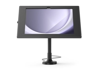 Our Flex Arm stand can be mounted on any flat surface, counter-top or to a wall for use as a secure interactive display or kiosk with a bendable arm that is great for corners and where counter space is limited. Limited cable management is available through the mount and arm of the stand and there is an adhesive no-screw base add-on available.