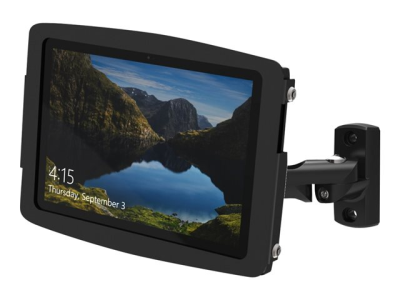 Swing Arm-stativet kan monteres på en hvilken som helst flat overflate, benkeplate eller vegg, og kan brukes som en sikker interaktiv skjerm eller kiosk.