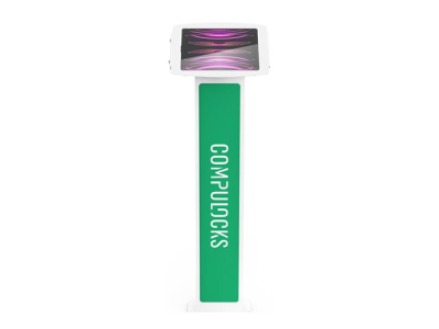Our BrandMe floor stand allows you to utilize a panel for branding, call to action or custom design to bring attention to your interactive display or kiosk. The tilting mount allows the iPad enclosure to be set in either portrait or landscape mode and the stand base offers additional security features, securing the power source and bolting the unit to the floor.