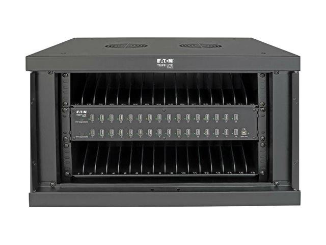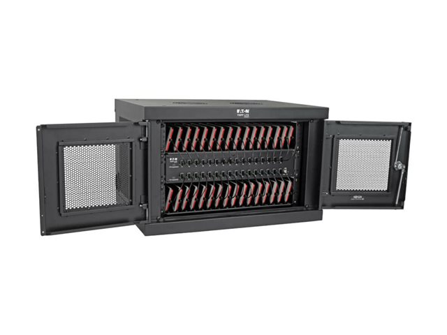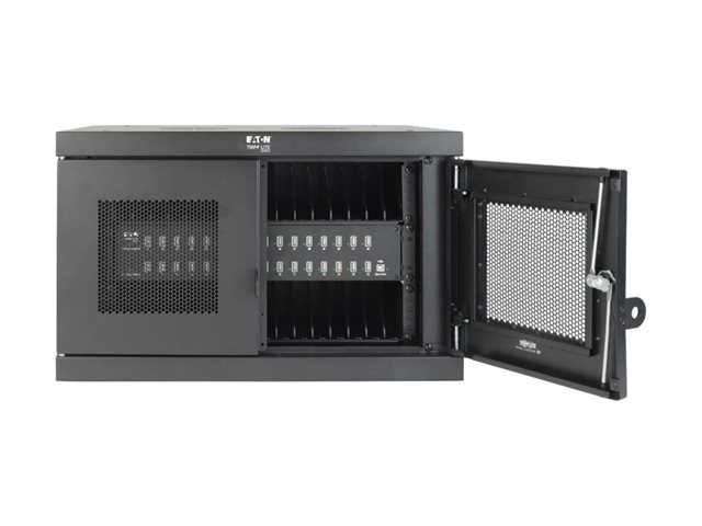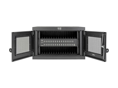 Eaton Tripp Lite Series 32-Device USB Charging Station Cabinet er en omfattende ladeløsning for smarttelefoner og andre USB-ladede enheter. Dette allsidige skapsystemet kan plasseres på et skrivebord eller monteres på en vegg, noe som gjør det ideelt for klasserom, kontorer og butikkmiljøer. Med 32 USB 2.0 A-ladeporter kan det lade flere enheter samtidig, slik at de alltid er klare til bruk. Skapet er bygget med en strømbryter for ekstra sikkerhet og har en robust stålkonstruksjon, noe som gjør det holdbart og sikkert. Den svarte pulverlakkerte overflaten bidrar ikke bare til holdbarheten, men gir også et elegant og profesjonelt utseende. Ladestasjonen er designet med tanke på brukervennlighet, og har et kabelhåndteringssystem, flyttbare skillevegger for enkel organisering og hurtigladefunksjoner. I tillegg har den avanserte sikkerhetsfunksjoner som overladings- og overstrømsbeskyttelse, samt EMI- og RFI-filtrering for å forhindre elektrisk interferens under lading. Med sine omfattende funksjoner og slitesterke design er Eaton Tripp Lite Series-ladestasjonen et viktig verktøy for å holde enhetene ladet, organisert og sikkert.